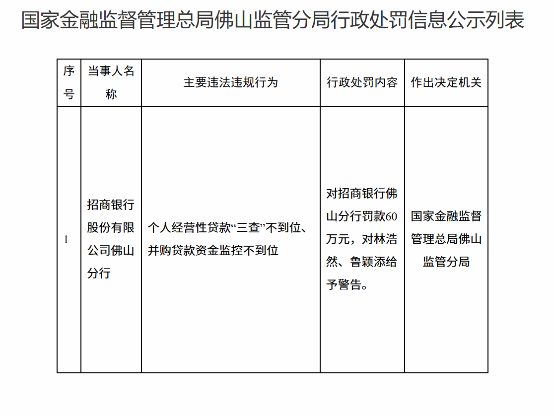 3月2日,国家金融监督管理总局佛山监管分局行政处罚信息公示列表显示,招商银行股份有限公司佛山分行因个人经营性贷款“三查”不到位、并购贷款资金监控不到位被罚款60万元。责任人林某然、鲁某添被警告。